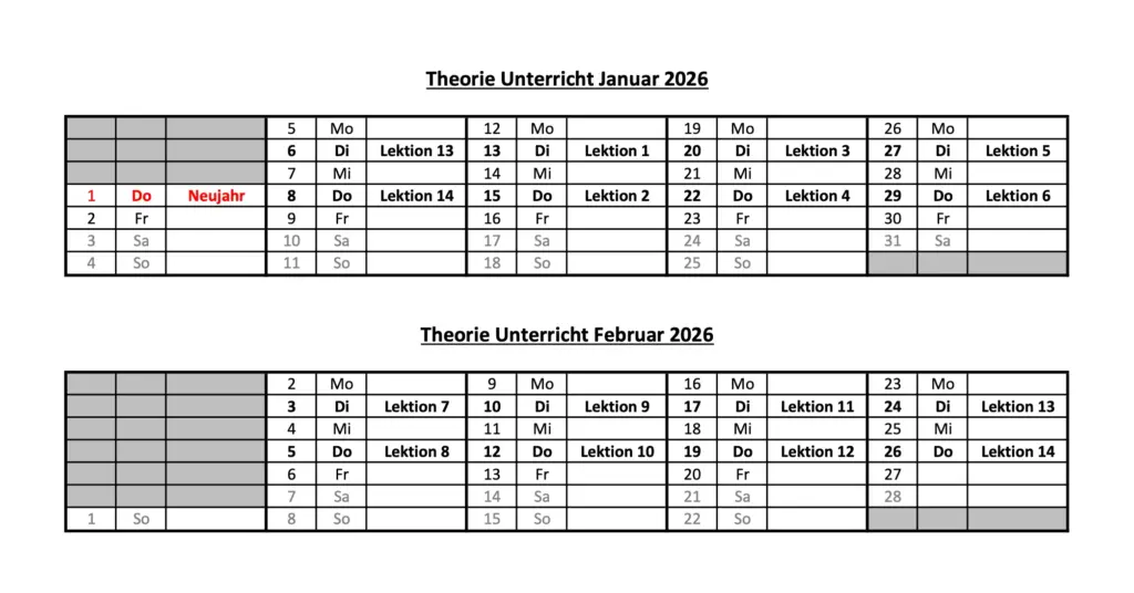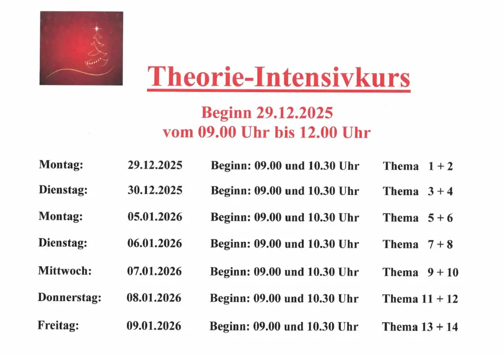 • Theorieunterricht: Dienstags und Donnerstags von 19:00 Uhr -20:30 Uhr,